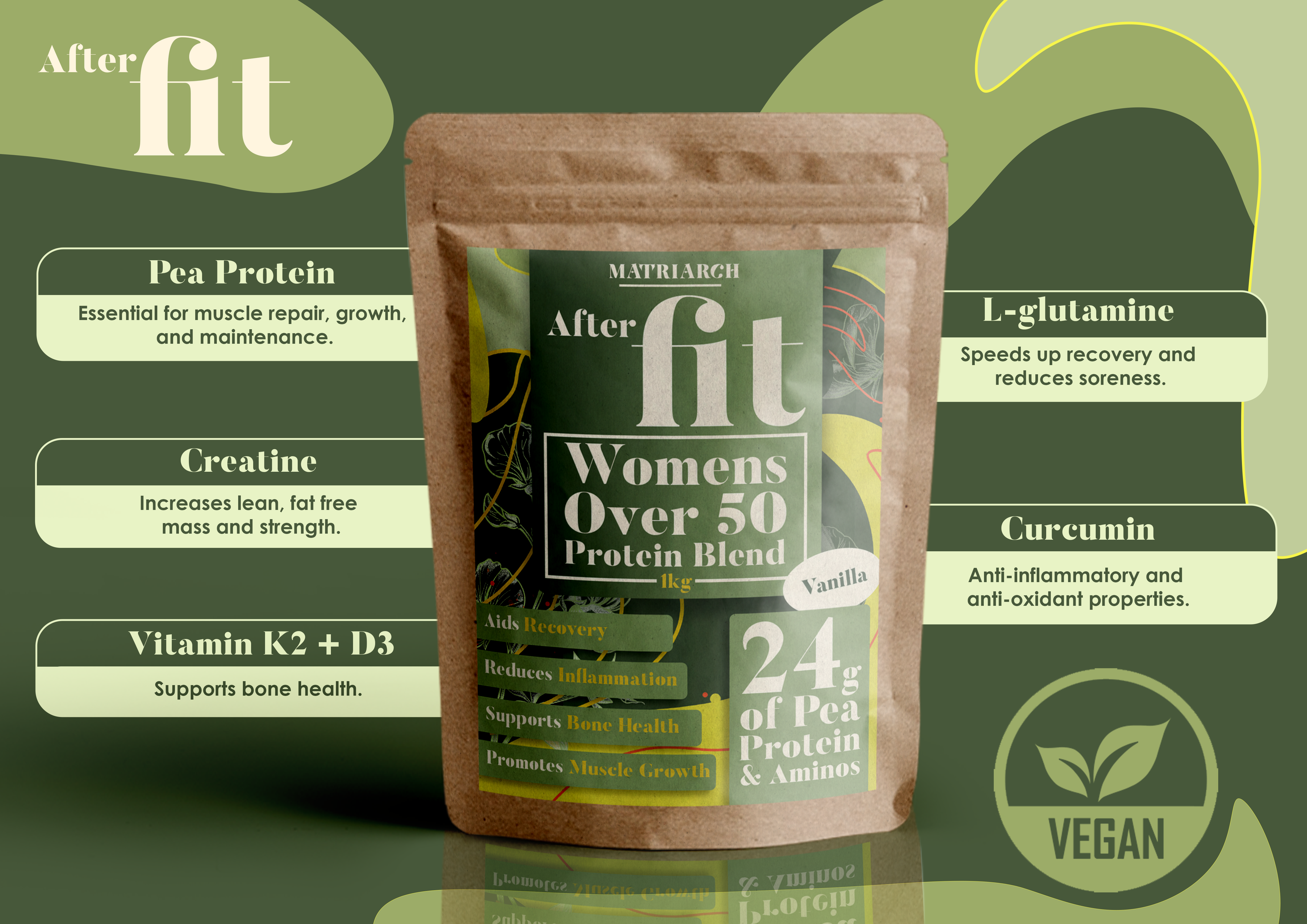 At Matriarch Nutrition, we offer a nutritionally complete blend, tailored to meet the specific needs of women over-50. After Fit supports your fitness journey by delivering essential nutrients that stimulate muscle growth, fortify bone health, and alleviate inflammation, ensuring you recover effectively from your workouts and reach your daily nutrition targets whist doing so.